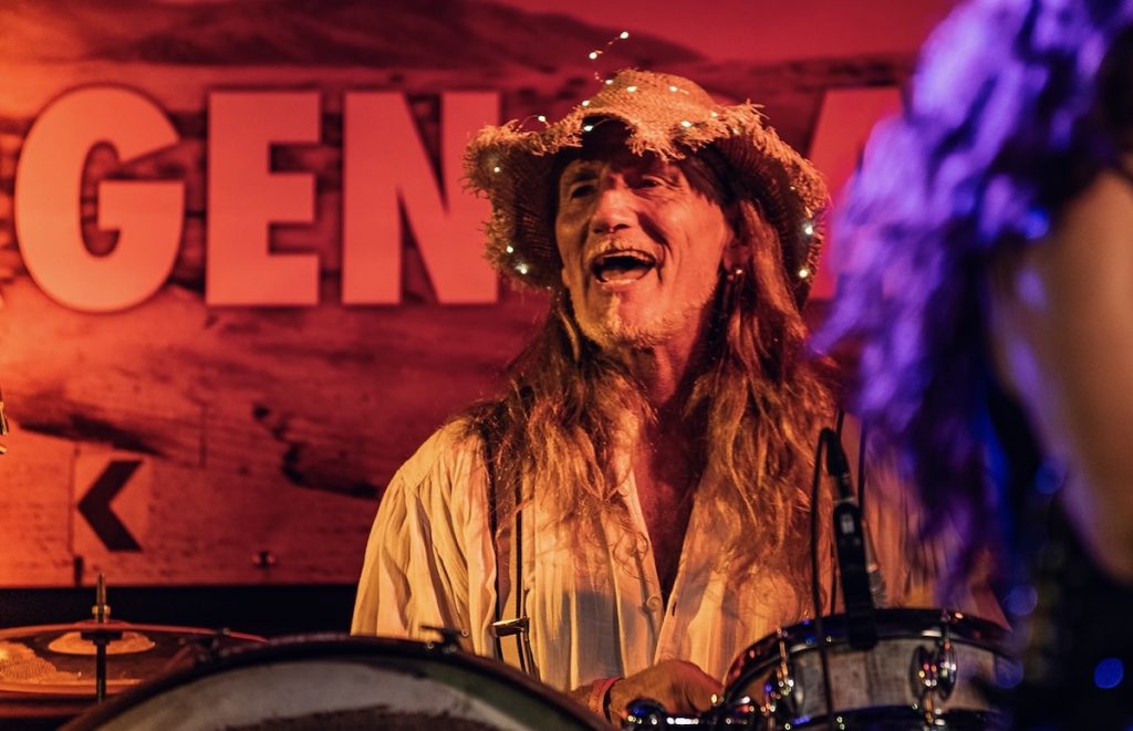 Auf seinem Customschlagzeug, dessen genaue Bauzeit nicht mehr nachvollziehbar ist, galoppierte er bereits im wilden Westen durch die Wüste Nevadas, bis ihm ein örtlicher County Sheriff zum Sozial Dienst in der Steve Morgen Band verholf.
